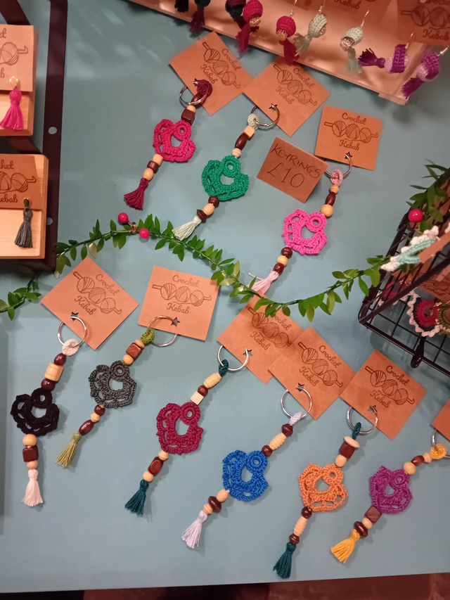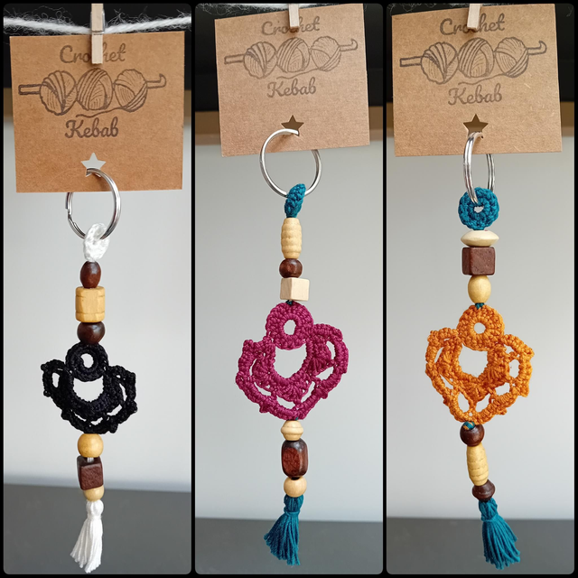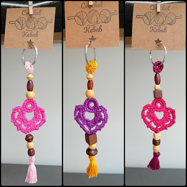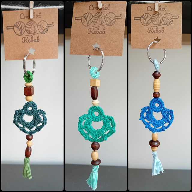 Keychain or handbag charm made with crocheted cotton and wooden beads