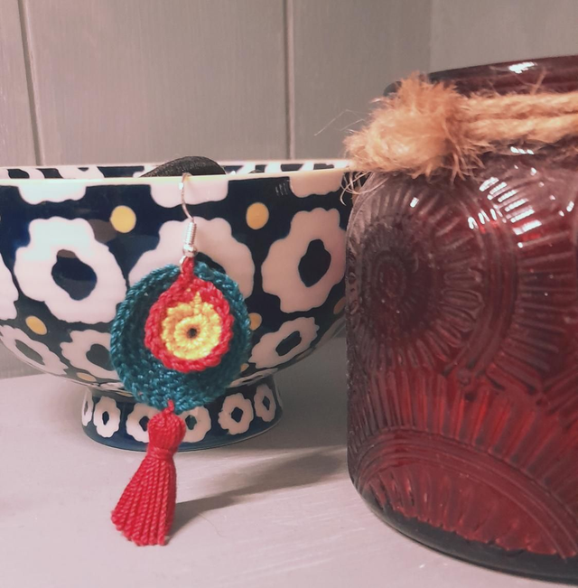 A peacock feather inspired multicoloured crochet earring, made with sterling silver hypoallergenic earring hooks